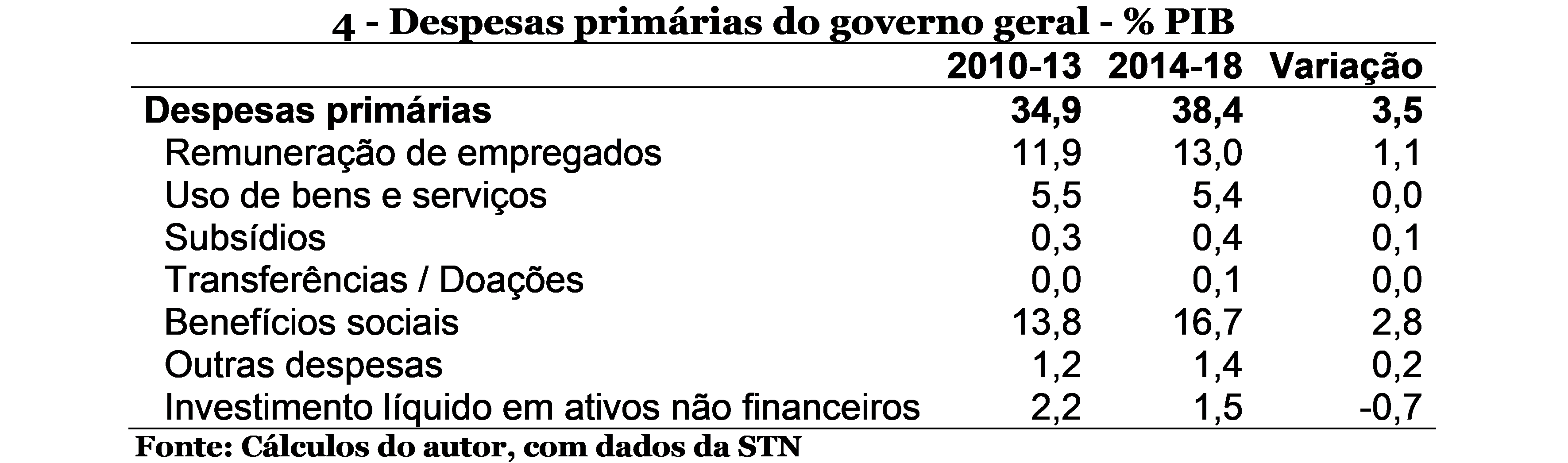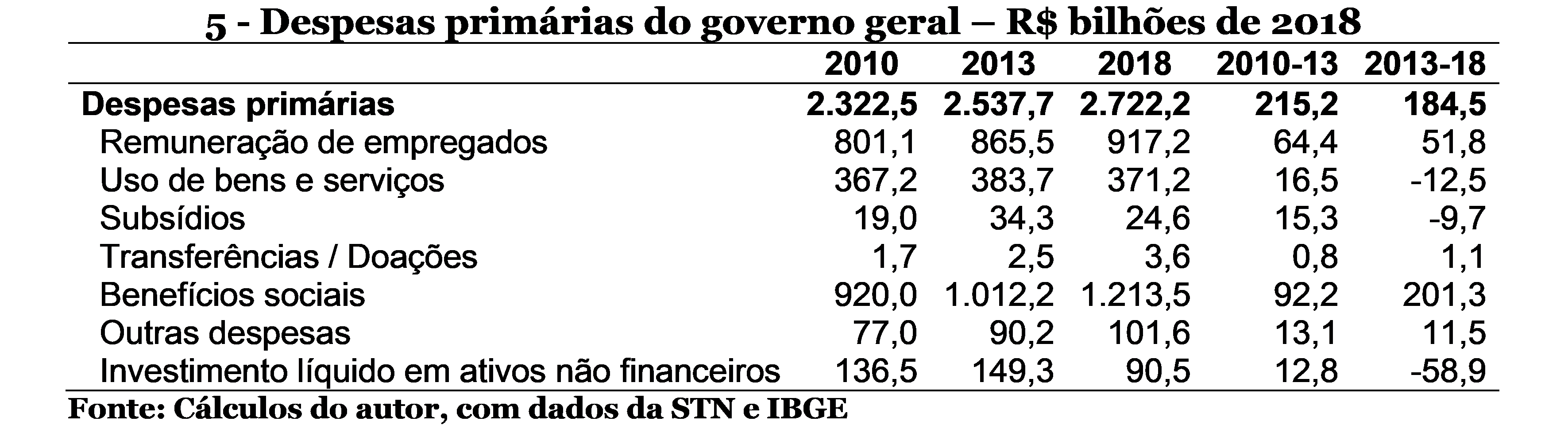 Assim, o conjunto das despesas primárias dos 3 níveis de governo aumentou R$ 185 bilhões (R$ 37 bilhões/ano) no período de déficits primários. As fontes de aumento, como notadas acima foram benefícios sociais (ou seja, previdência) adicionando R$ 201 bilhões, e o funcionalismo, R$ 52 bilhões.