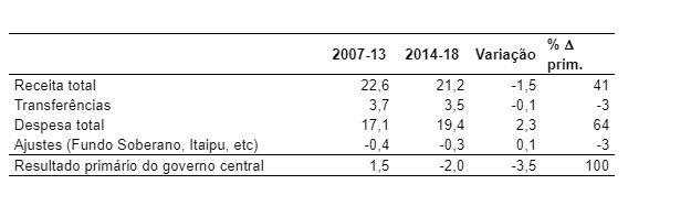 A tabela acima mostra a variação do resultado primário entre os anos de 2007 e 2013 e de 2014 a 2018. No segundo intervalo, quando o superávit se transformou em déficit (variação negativa de R$ 217 bilhões), as despesas aumentaram R$ 115 bilhões, enquanto as receitas caíram R$ 92 bilhões. Muito embora o crescimento médio das despesas (R$ 23 bilhões por ano) tenha sido mais lento do que no período anterior (R$ 46 bilhões/ano), ele representou mais da metade (53%) da piora observada do resultado primário.