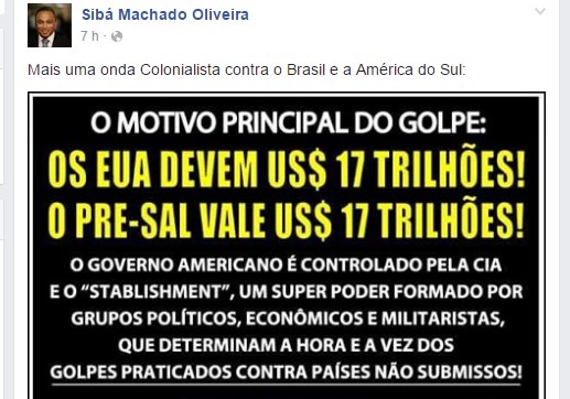 SÃO PAULO – O deputado federal do PT, Sibá Machado (AC), que já havia criado polêmica ao postar foto de um evento esportivo na Coreia do Sul para divulgar uma manifestação contra o impeachment, chamou a atenção nas redes sociais novamente ao dizer o que ele acredita ser o motivo para o “golpe” em andamento no Brasil. Segundo Machado, é tudo uma conspiração da CIA, que domina o governo dos Estados Unidos por baixo dos panos e quer fomentar um golpe de estado no Brasil para pôr as mãos no pré-sal.