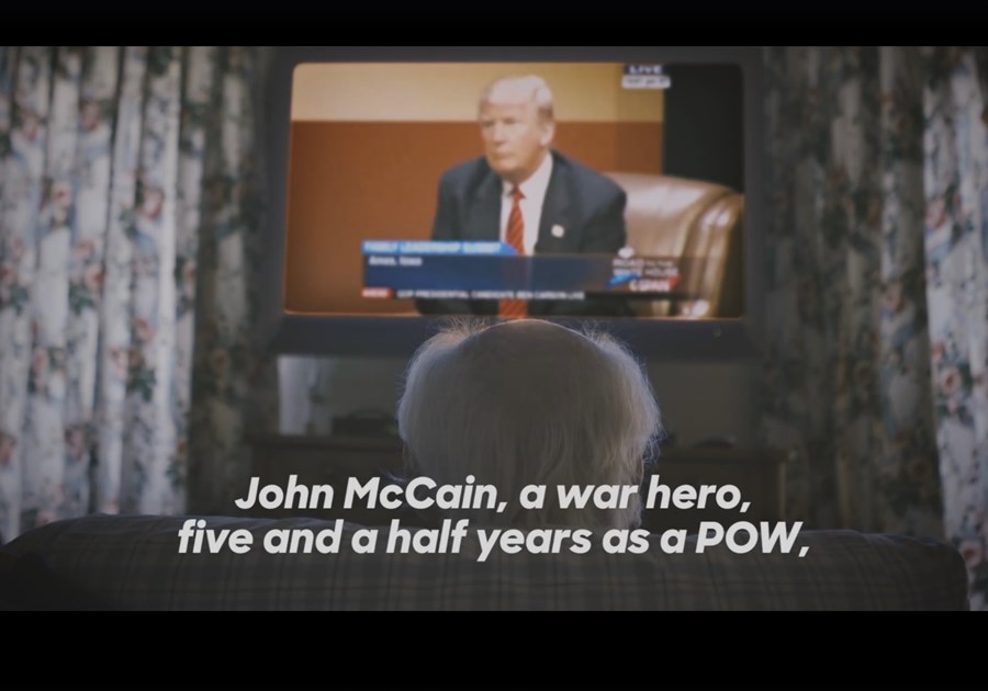 O vídeo mostra um trecho de um debate em que Donald Trump diz que John McCain (um dos líderes do partido republicano) só é considerado um herói de guerra porque ele foi capturado. “Eu não gosto de quem foi capturado”, diz o candidato.