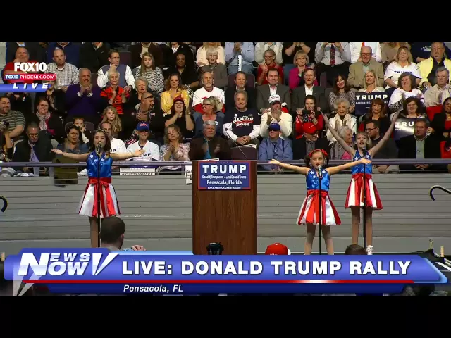 SÃO PAULO – Na última semana, durante uma comício em Pensacola, no estado da Flórida, Donald Trump voltou a chamar atenção em sua campanha presidencial. Desta vez o destaque ficou para um trio de garotas vestidas com a bandeira dos EUA cantando uma música de campanha bastante patriótica. Como não poderia deixar de ser, a internet se dividiu sobre a apresentação.