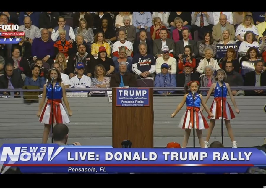 SÃO PAULO – Na última semana, durante uma comício em Pensacola, no estado da Flórida, Donald Trump voltou a chamar atenção em sua campanha presidencial. Desta vez o destaque ficou para um trio de garotas vestidas com a bandeira dos EUA cantando uma música de campanha bastante patriótica. Como não poderia deixar de ser, a internet se dividiu sobre a apresentação.
