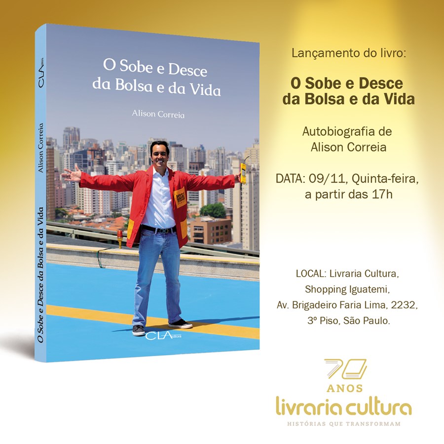 O livro “O Sobe e Desce da Bolsa e da Vida” (Editora: CLA, 155 páginas. Preço Sugerido: R$ 53,00. Preço do eBook Kindle: R$ 35 na Amazon) será lançado oficialmente dia 9 de novembro (quinta-feira) na Livraria Cultura do Shopping Iguatemi (zona sul de São Paulo), mas tive a honra de já ter acesso à obra e ser uma das primeiras pessoas a ler o resultado final desta história (depois, é claro, dos editores e da Fernanda, esposa do Alison).