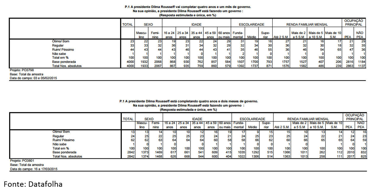 As tabelas abaixo permitem uma análise mais profunda sobre a mudança na percepção do eleitor. A primeira refere-se ao Datafolha de 3 a 5 de fevereiro, enquanto a segunda mostra o resultado da pesquisa feita em 16 e 17 de março.