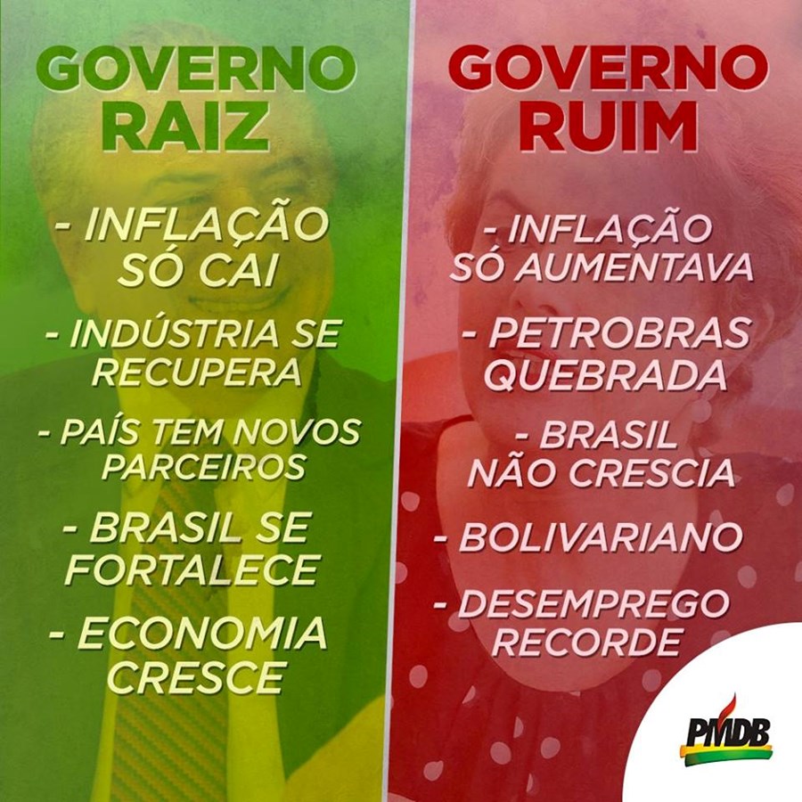 Com o governo do PMDB, o país começa a se reerguer e reabre as portas fechadas na gestão anterior. O PMDB, sem populismo e com responsabilidade, pensa primeiro nos brasileiros”. A imagem, dividida ao meio, traz comparações entre ações do governo Dilma e do governo Temer, destacando principalmente as ações no campo econômico. Contudo, o post, além de fazer uma adaptação do meme original, gerou muitas controvérsias e foi bastante criticado pelos internautas. Entre as críticas, a de que Temer era vice de Dilma.