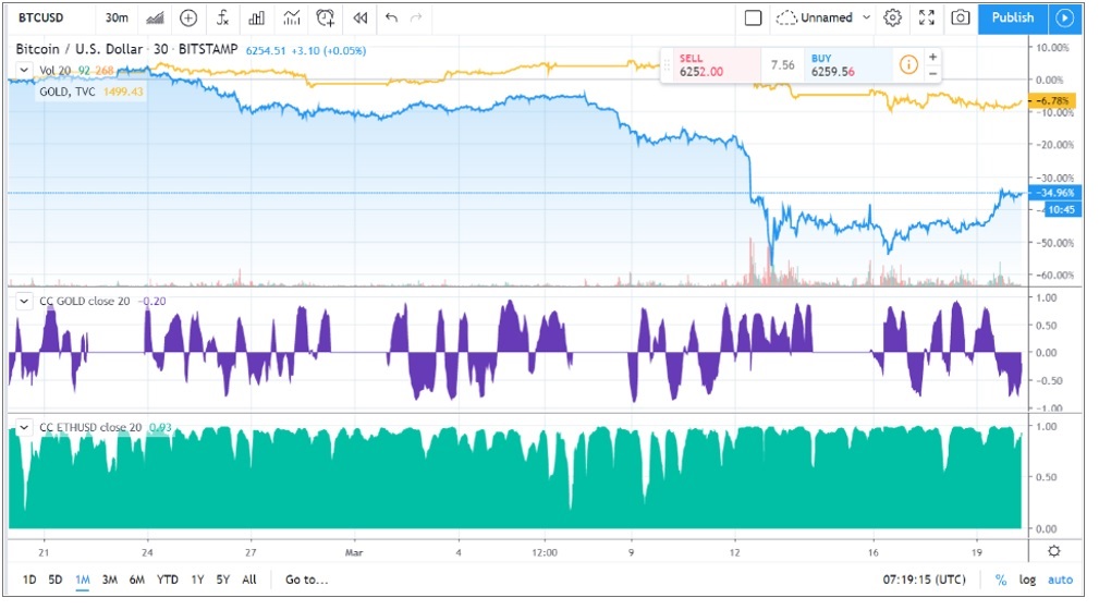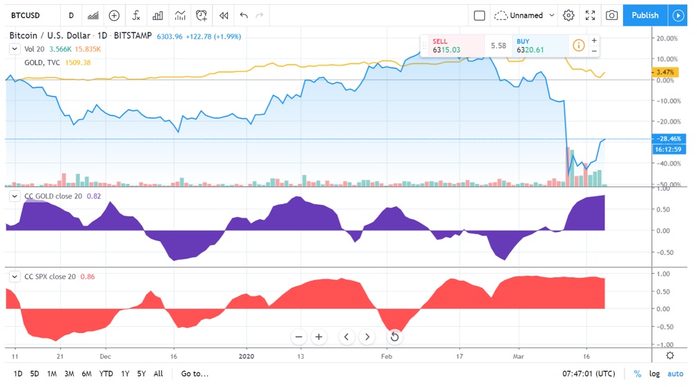 “Cash is king” é o mote do mercado. E cash em dólares! Isso pode distorcer minha análise, mas me baseio na correlação de longo prazo do BTC com o ouro.