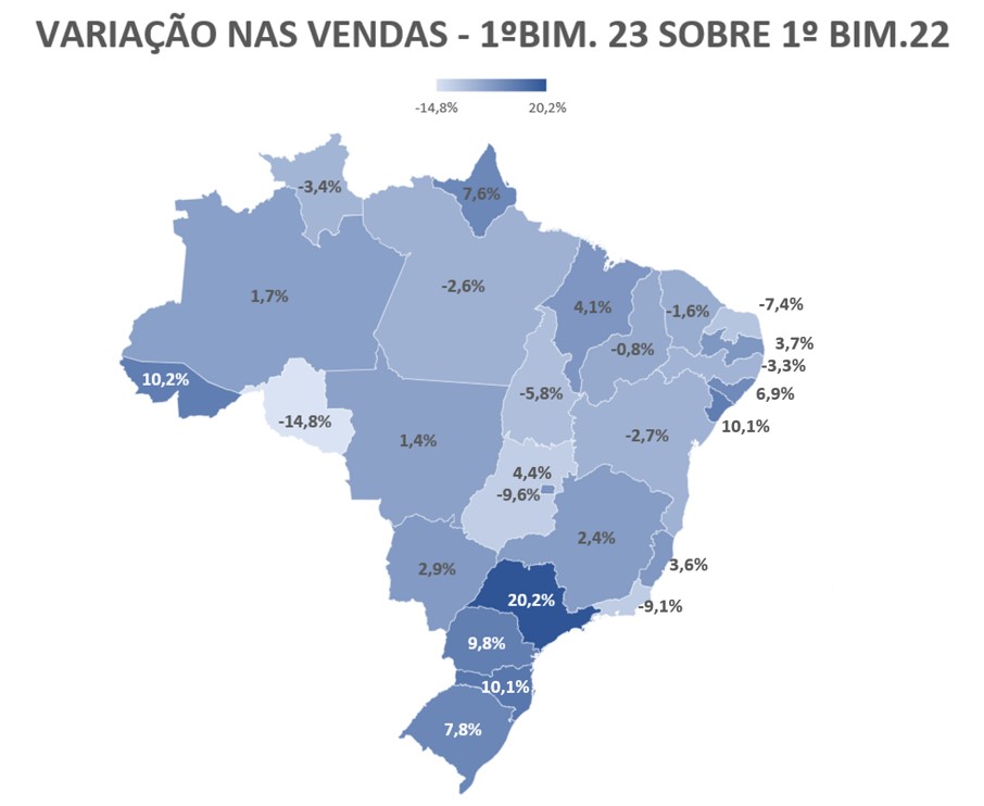 Das 27 unidades da federação, 11 estados (40% do total) registraram queda nas vendas, sendo que a maioria dos estados que caíram estão nas regiões Norte e Nordeste. O estado que teve o pior resultado foi Rondônia, com quase 15% de retração.