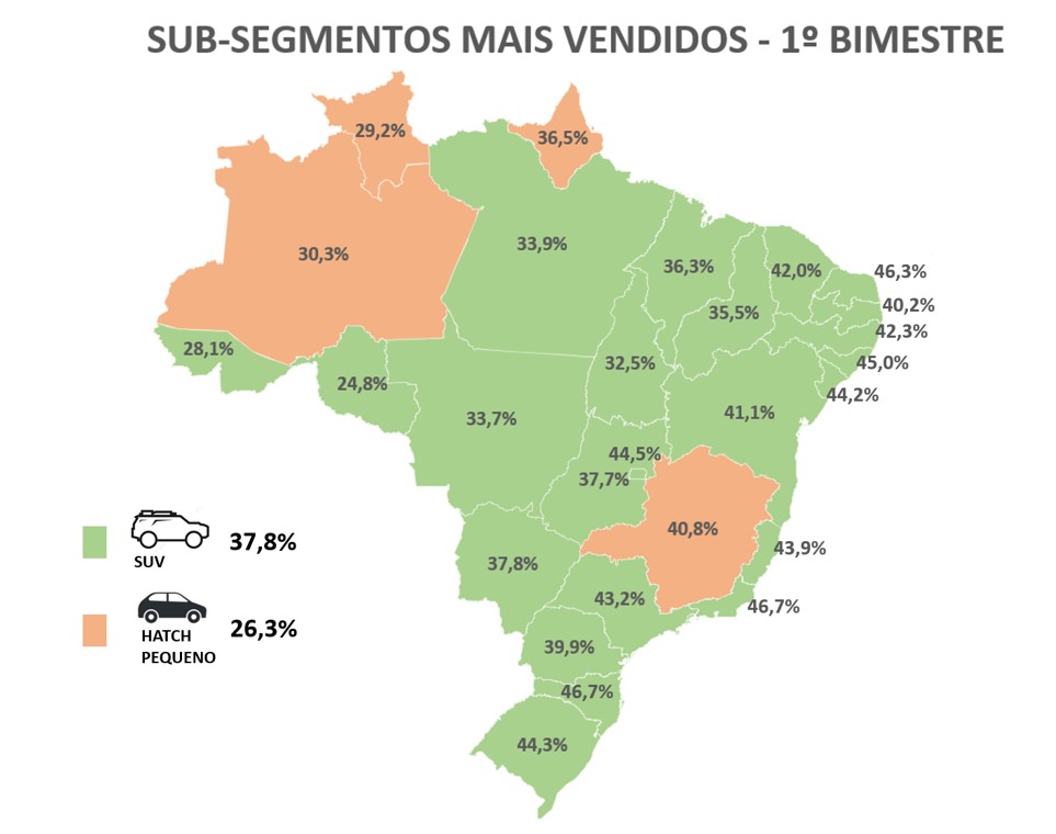 Em segundo lugar aparecem os Hatch Pequenos, preferência de 26% dos clientes brasileiros. De fato, os Hatch só são mais consumidos em quatro estados: Amapá, Amazonas, Minas Gerais e Roraima. Em Minas, as locadoras puxam o segmento para cima. Já nos estados do Norte, onde os consumidores são mais sensíveis no quesito “renda”, eles ainda possuem o seu “sex appeal”.