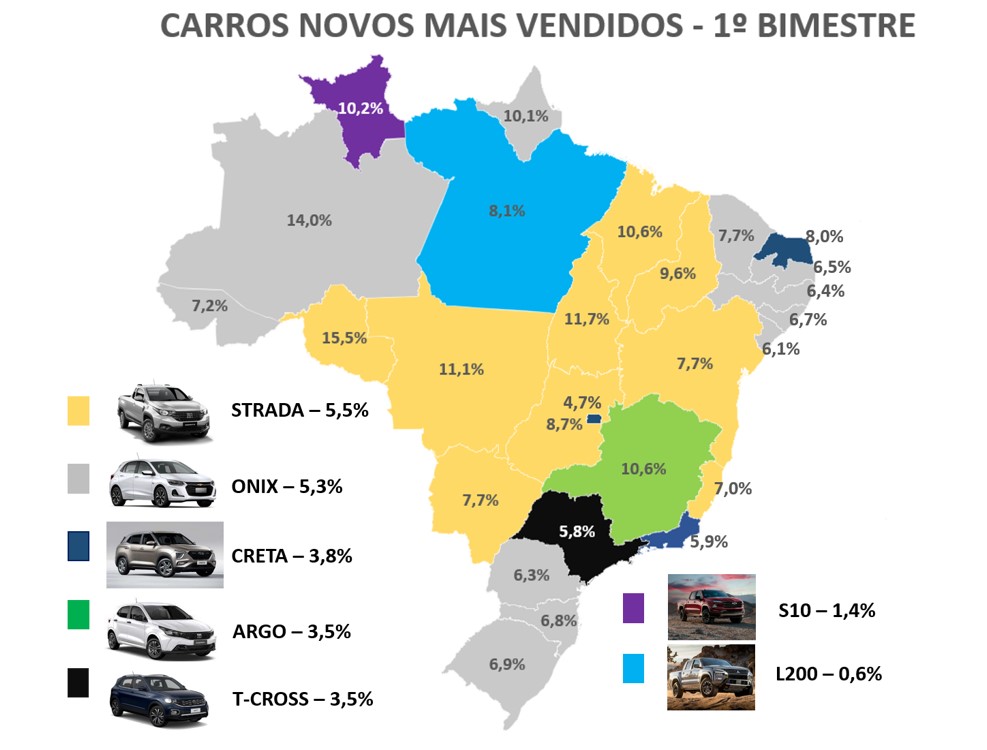 A Strada, por enquanto, é a líder de vendas nacional e lidera também em outros nove estados. O Onix da GM se encontra na 2ª colocação nacional, mas é o carro mais vendido em 11 estados. Ou seja, a Strada é a líder geral em vendas, mas o Onix possui a liderança em mais estados.