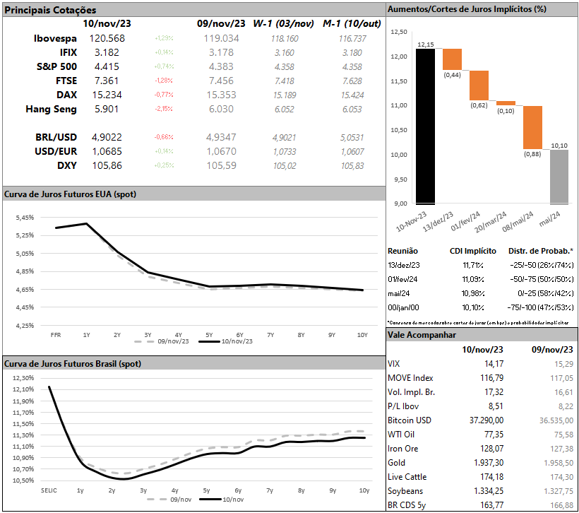 Vale ainda acompanhar o IPCA de sexta passada, que foi muitíssimo bem recebido. Veio abaixo das expectativas (0,24% no mês) e muito mais comportado, tanto no nível do núcleo, quanto no nível de dispersão – especialmente serviços. Boas notícias! Temos também o Bitcoin que não para de subir numa expectativa animada de liberação de um ETF de spot, e o petróleo que não para de cair, numa expectativa pouco animada de menos atividade econômica à frente. Bom pra quem está com estoques de emergência baixos (oi Zé Biden); ruim pra quem é exportador de petróleo e já está cortando produção pra tentar manter o barril alto (oi MBS).