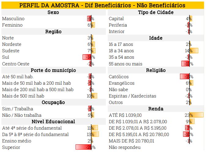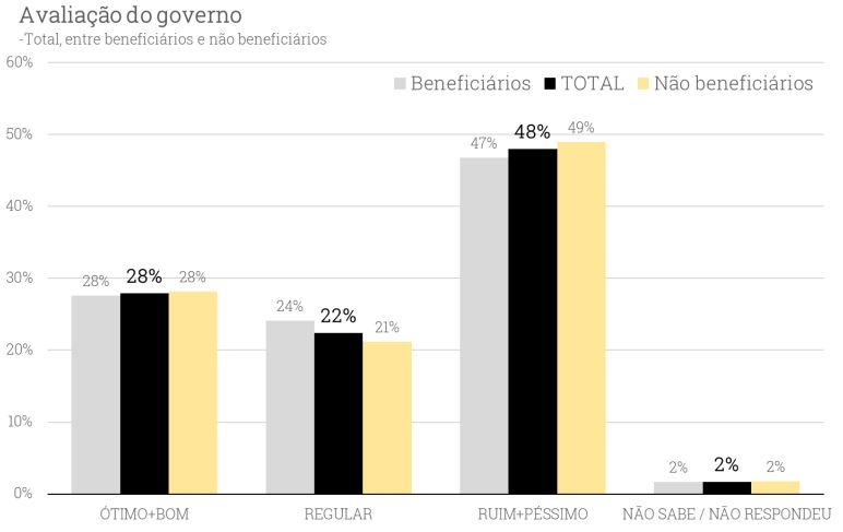 O passo inicial foi examinar se havia diferença significativa na taxa de aprovação entre os que declaram ter recebido o benefício ou ter expectativa de recebe-lo em relação àqueles que não receberam nem esperam recebe-lo. Há diferença pequena em que entre os beneficiários e não beneficiários que avaliam o governo como regular (24% vs 21%) e como ruim e péssimo (47% vs 47%). Portanto, não há evidência de diferença significativa de aprovação entre os dois grupos.