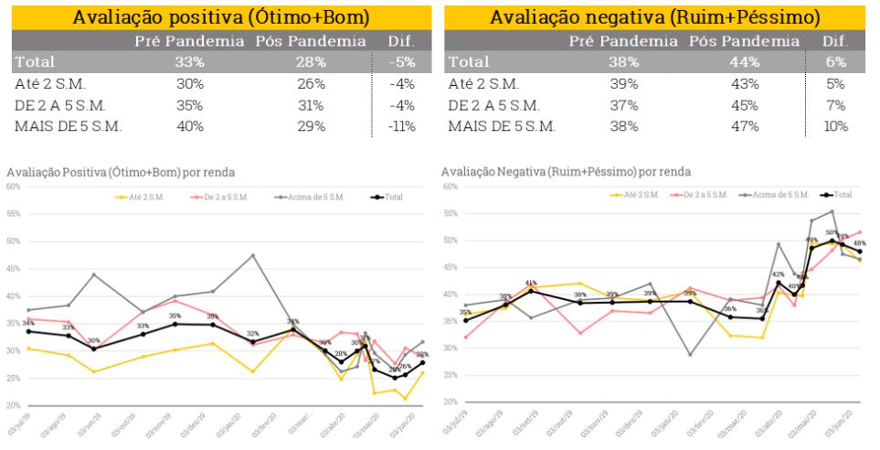 E nosso modelo de aprovação sugere que há um descolamento entre a aprovação efetiva, que foi de 28% na leitura mais recente, com a projetada para o fim de junho, que seria de algo abaixo de 20%. Tal diferença pode ser explicada pelo efeito dos programas de manutenção da renda, em especial o benefício emergencial de R$ 600, que é o maior deles.