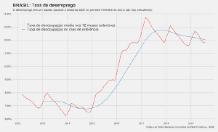 Em geral, há um padrão sazonal claro na evolução da taxa de desemprego, que cresce entre janeiro e março e cai entre abril e dezembro. Esse padrão é visto no gráfico e só foi quebrado em 2015 e 2016, no meio de uma avassaladora recessão.