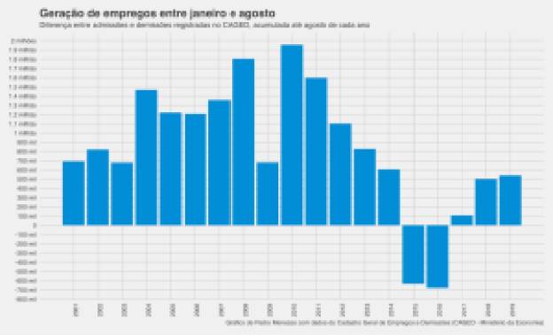 Nos primeiros 8 meses no ano, o CAGED registrou cerca de 540 mil empregos. Foi o melhor desempenho para o período desde 2014, quando o saldo de janeiro e agosto chegou a 606 mil.