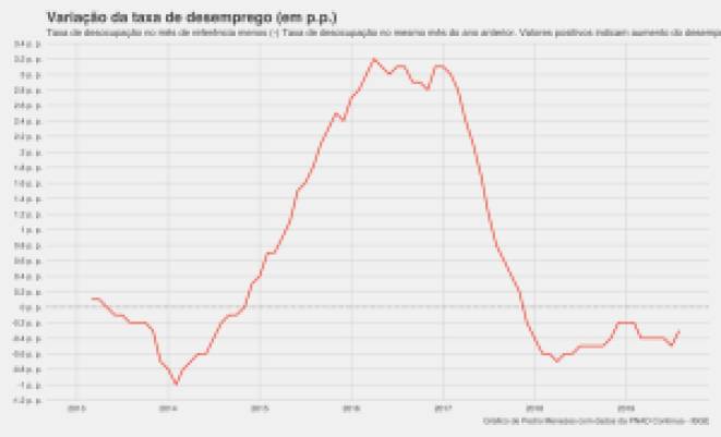 O próximo gráfico mostra justamente isso, a velocidade de redução da taxa de desemprego. Nele, é possível ver o vertiginoso aumento registrado até 2017, que se converteu em queda na virada para 2018. Também é possível notar a desaceleração desta redução entre 2018 e 2019.