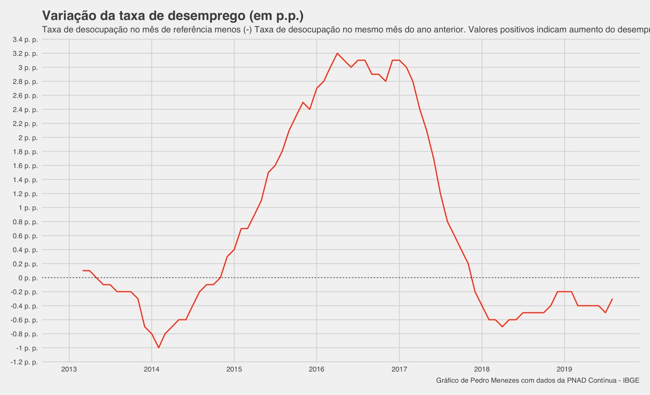 Em agosto de 2019, último número divulgado, a taxa de desocupação diminuiu 0,3 p. p. com relação a agosto de 2018. Mas esse ritmo é baixo, não. Chega a metade dos -0,7 p. p. que eram registrados no início de 2018. Isto é, o desemprego continua caindo, mas está caindo cada vez menos.