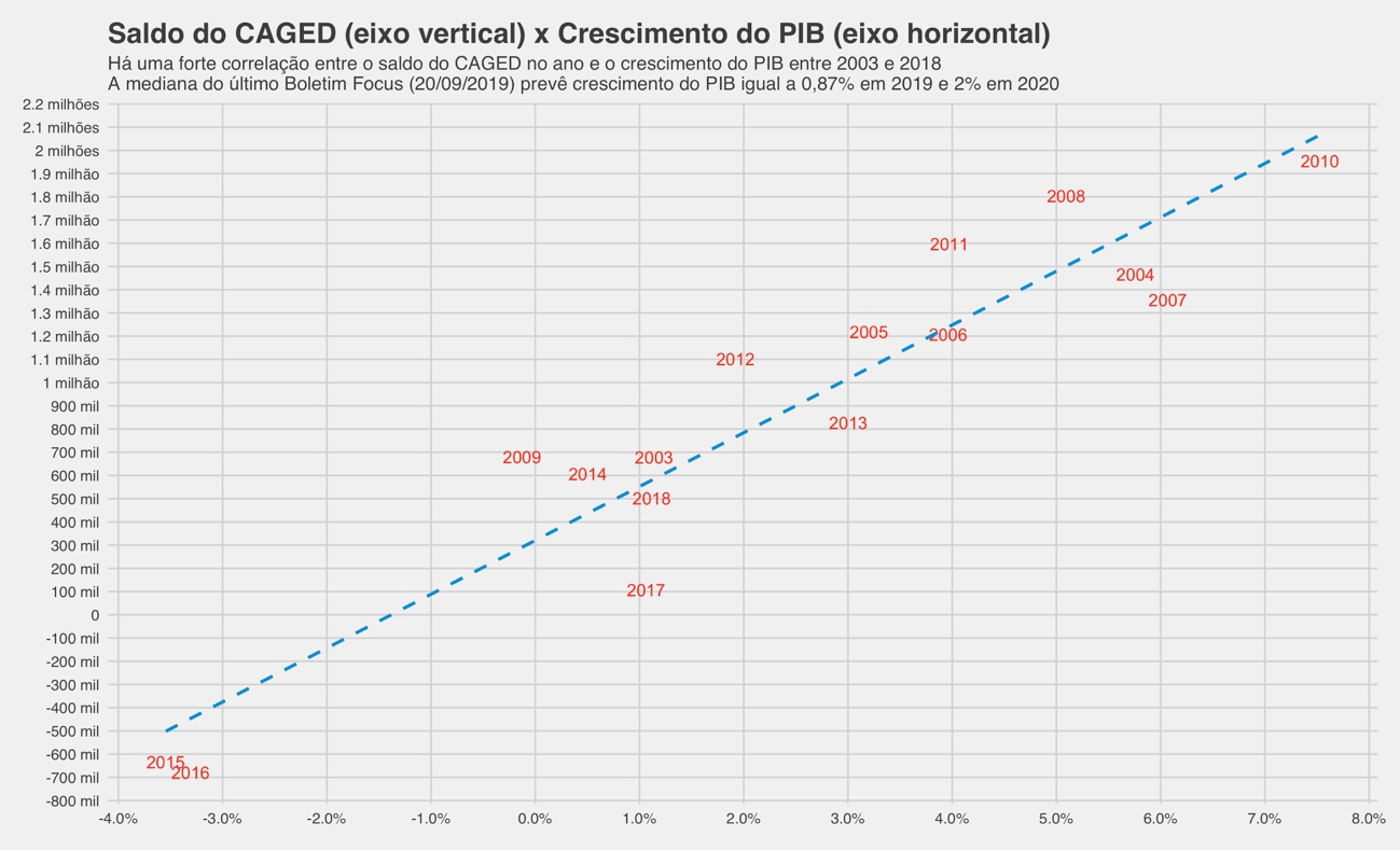 O lado bom é que uma melhoria no crescimento do PIB provavelmente gerará impacto perceptível no bem-estar do cidadão. Um crescimento próximo de 2% em 2020, como se prevê, pode gerar 800 mil empregos formais no ano caso fique em cima da reta de regressão abaixo.