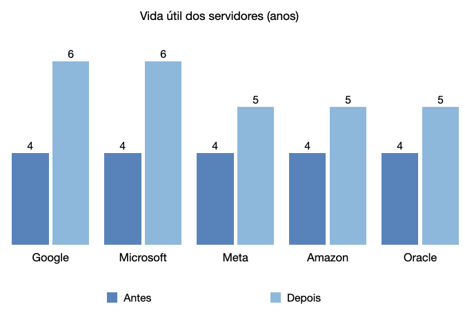 Uma das medidas, essa já anunciada nos resultados do último trimestre foi a revisão da estimativa de vida útil dos servidores. A Alphabet não está sozinha nessa iniciativa, com grandes nomes também fazendo o mesmo movimento nos últimos anos: