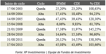 A tabela apresenta um melhor desempenho dos fundos multimercados em ciclos de corte de taxa básica de juros (Selic), e, consequentemente, queda dos juros de mercado. Em contrapartida, esse índice costuma apresentar um desempenho abaixo do CDI em ciclos de aumento de juros, conforme observamos na tabela abaixo.