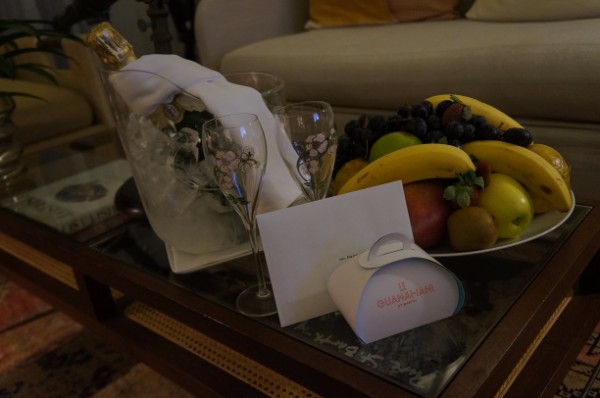 Uma taça de champanhe me espera na recepção. Uma garrafa de champanhe me espera no quarto. Quarto não, na suíte admiral! Champanhe, não: uma Perrier Jouët Grand Brut.