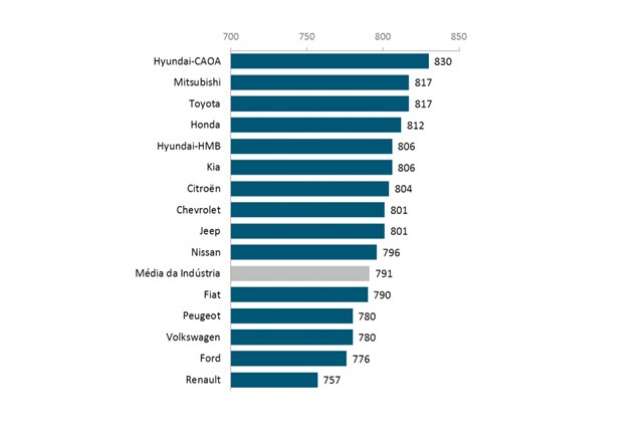 Na segunda colocação vem a Mitsubishi com 817 pontos, empatada com a Toyota, que perdeu a primeira colocação após dois anos seguidos. A pesquisa concluiu que o agendamento do serviço na concessionária, realizado via canais digitais em vez de contato telefônico, eleva a satisfação dos clientes.