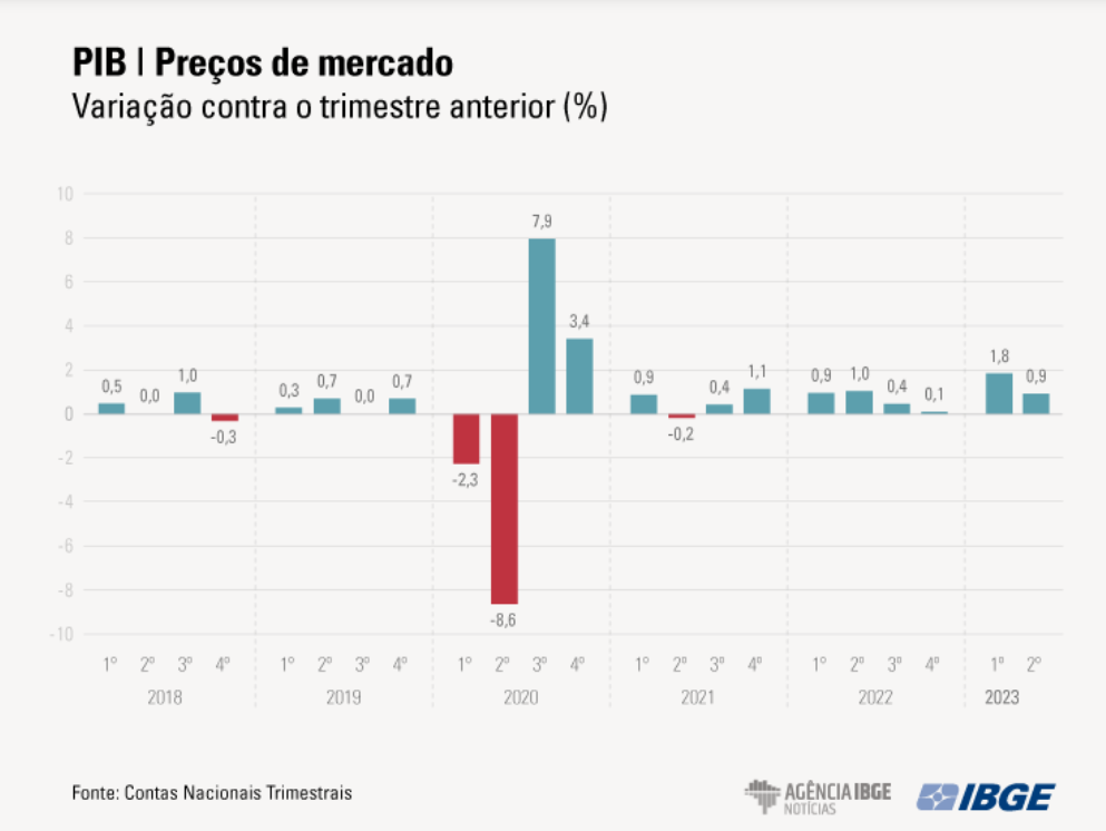 O Produto Interno Bruto (PIB) brasileiro cresceu 0,9% no segundo trimestre deste ano (2T23) frente ao trimestre anterior, acima do esperado, ainda que com desaceleração em relação ao avanço de 1,8% no 1T23, conforme informou o Instituto Brasileiro de Geografia e Estatística (IBGE) nesta sexta-feira (1). Na comparação com igual período de 2022, o avanço foi de 3,4%.