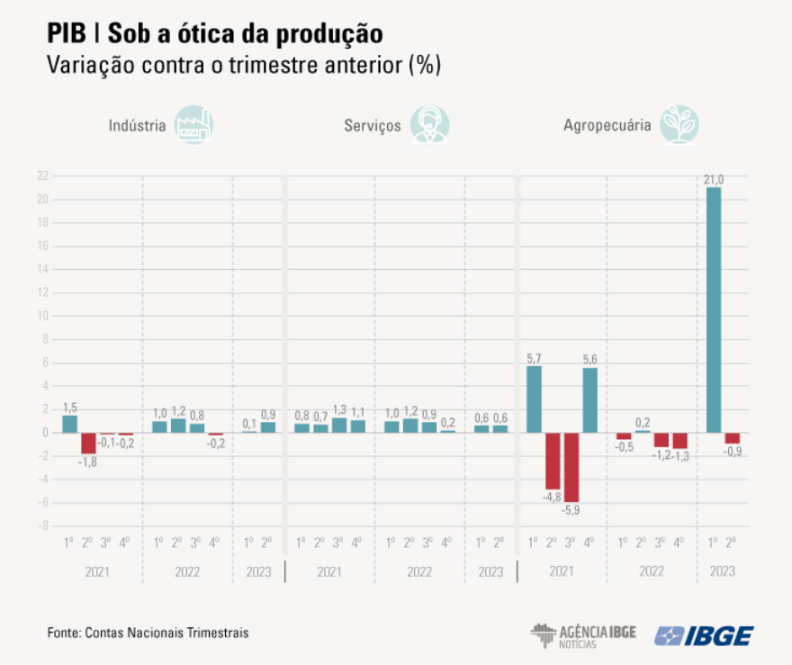 Também frente ao trimestre anterior, o consumo do governo cresceu 0,7%, quarto resultado positivo seguido. Quanto aos investimentos (Formação Bruta de Capital Fixo), o cenário foi de estabilidade (0,1%). A taxa de investimento foi de 17,2% do PIB, inferior à do mesmo período de 2022 (18,3%). Esse indicador representa a parcela de investimentos no total da produção de bens e serviços finais produzidos no país.