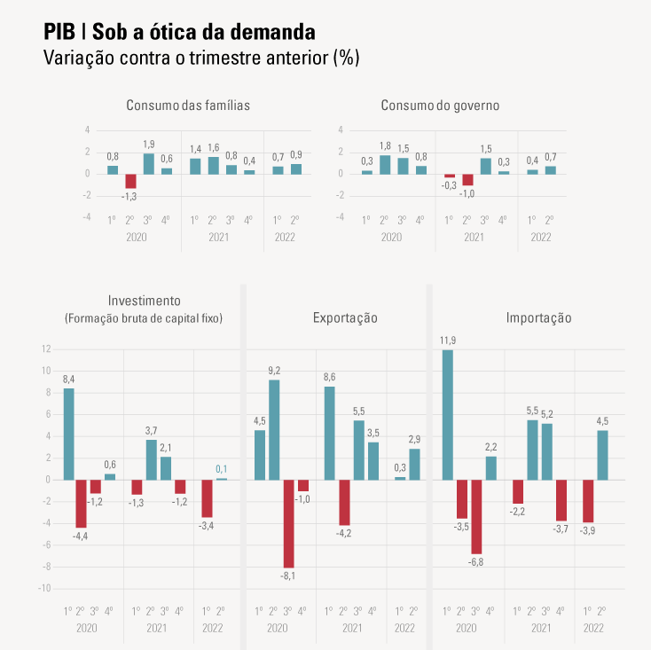 No mesmo período, a taxa de poupança também caiu: passou de 18,4%, no segundo trimestre do ano passado, para 16,9% no mesmo período deste ano. “Esse resultado era esperado e já acontece desde o primeiro trimestre. Durante a pandemia, houve aumento porque as famílias de maior renda, por não poderem consumir certos serviços, pouparam esse dinheiro excedente. Com a normalização da demanda e oferta dos serviços, a taxa de poupança caiu”, explica.
