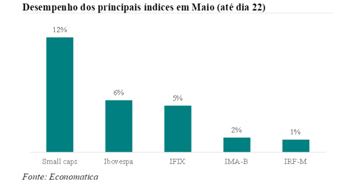 A Guide aponta que as ações “small caps” tiveram o melhor desempenho no mês, com avanço de cerca de 12%, seguidas pelo Ibovespa e IFIX ([índice de fundos imobiliários, com alta de cerca de 5%).