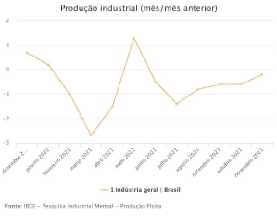 De janeiro a novembro de 2021, o índice da produção industrial mostra expansão positiva, de 4,7%, frente igual intervalo de 2020 – mas com tendência de desaceleração nos dados do final do ano passado.