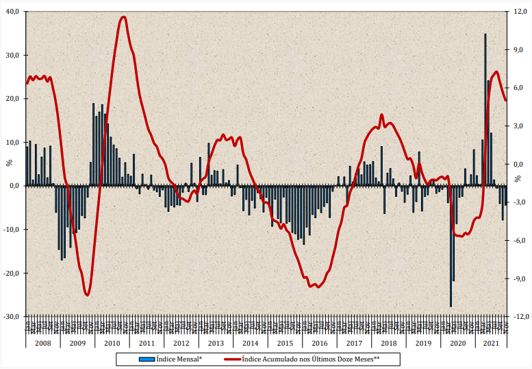 Em 12 meses, queda acumulada é de 5%. Até novembro de 2021 a queda é de 4,7%.