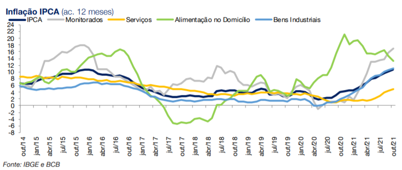 Para a inflação medida pelo IPCA, a estimativa da equipe econômica subiu para 9,7% em 2021, de 7,9% antes, e 4,70% em 2022, contra 3,75% no boletim anterior, publicado em setembro. O centro da meta de inflação é de 3,75% neste ano e 3,5% no próximo, nos dois casos com margem de tolerância de 1,5 ponto para mais ou para menos.