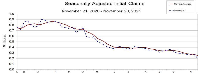 Conforme os dados da leitura encerrada em 20 de novembro, o número com ajuste sazonal desta semana representa uma diminuição de 71.000 ante o nível da semana anterior.