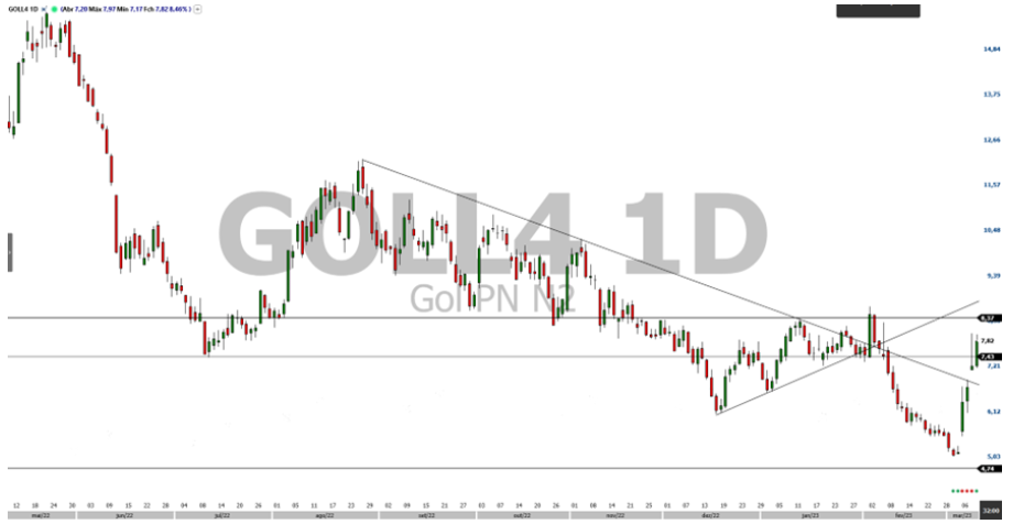 Para ele, a próxima resistência de GOLL4 fica no preço de R$ 8,37, após ter conseguido romper um patamar de preço relevante de R$ 7,43 (preço que marca a mínima do ano anterior).