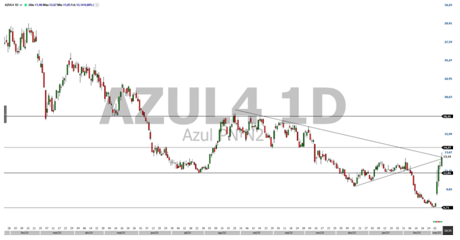 Para Matheus Lima, analista técnico da Top Gain, a Azul vem de uma tendência de baixa muito forte há muitos meses e, ao longo desse tempo, pontos de suporte e resistência foram deixados para trás.