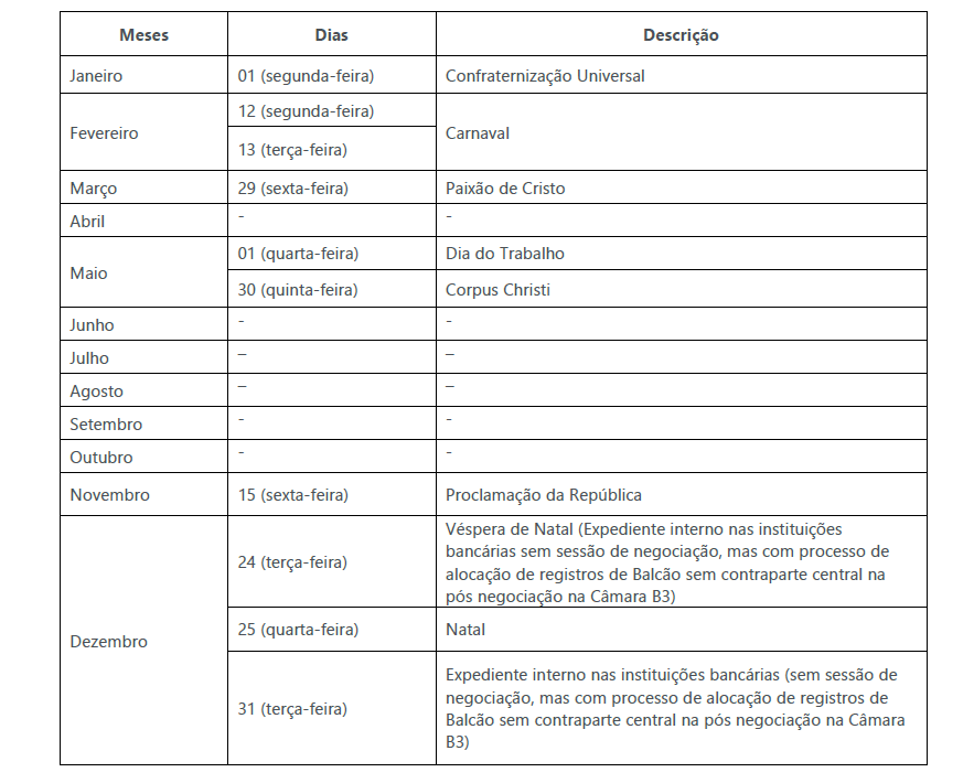 Não haverá registro de operações de títulos do agronegócio, com exceção do dia 31 de dezembro de 2024 (terça-feira), cujo horário de funcionamento para o registro das operações com títulos do agronegócio será reduzido, encerrando-se às 12h.