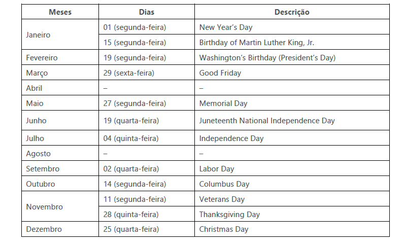 Abaixo, estão listados os feriados nos EUA: