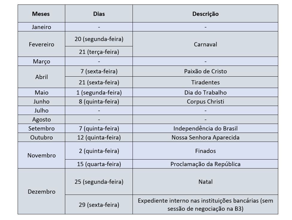 A B3 informou que, durante os dias citados. não haverá nenhuma negociação atrelada à B3. Dessa forma, estarão suspensos os ativos listados na B3, Tesouro Direto, Câmara de Câmbio e outros serviços.
