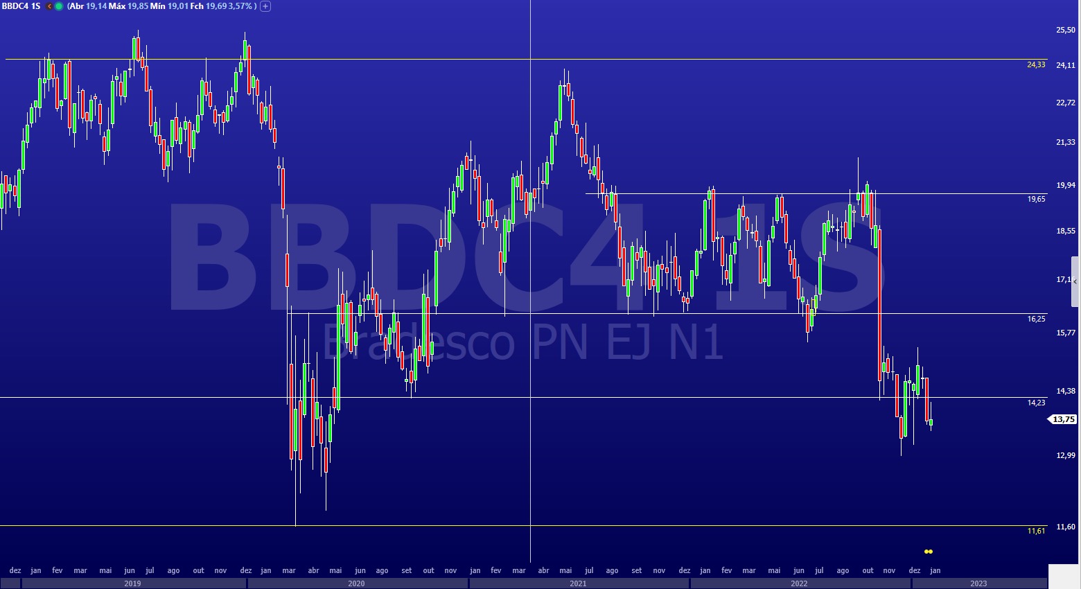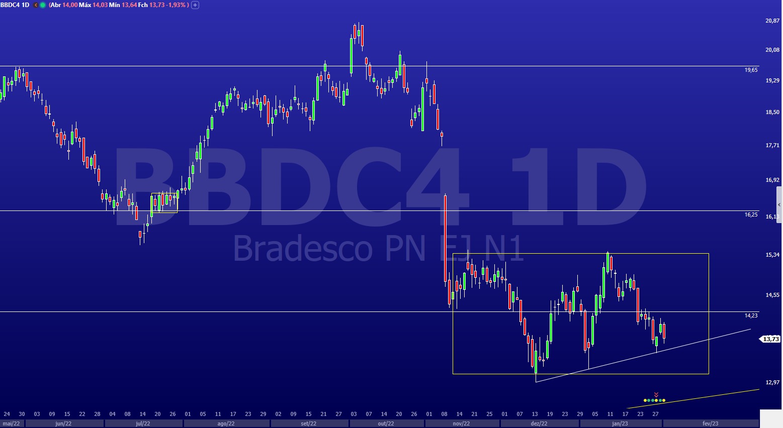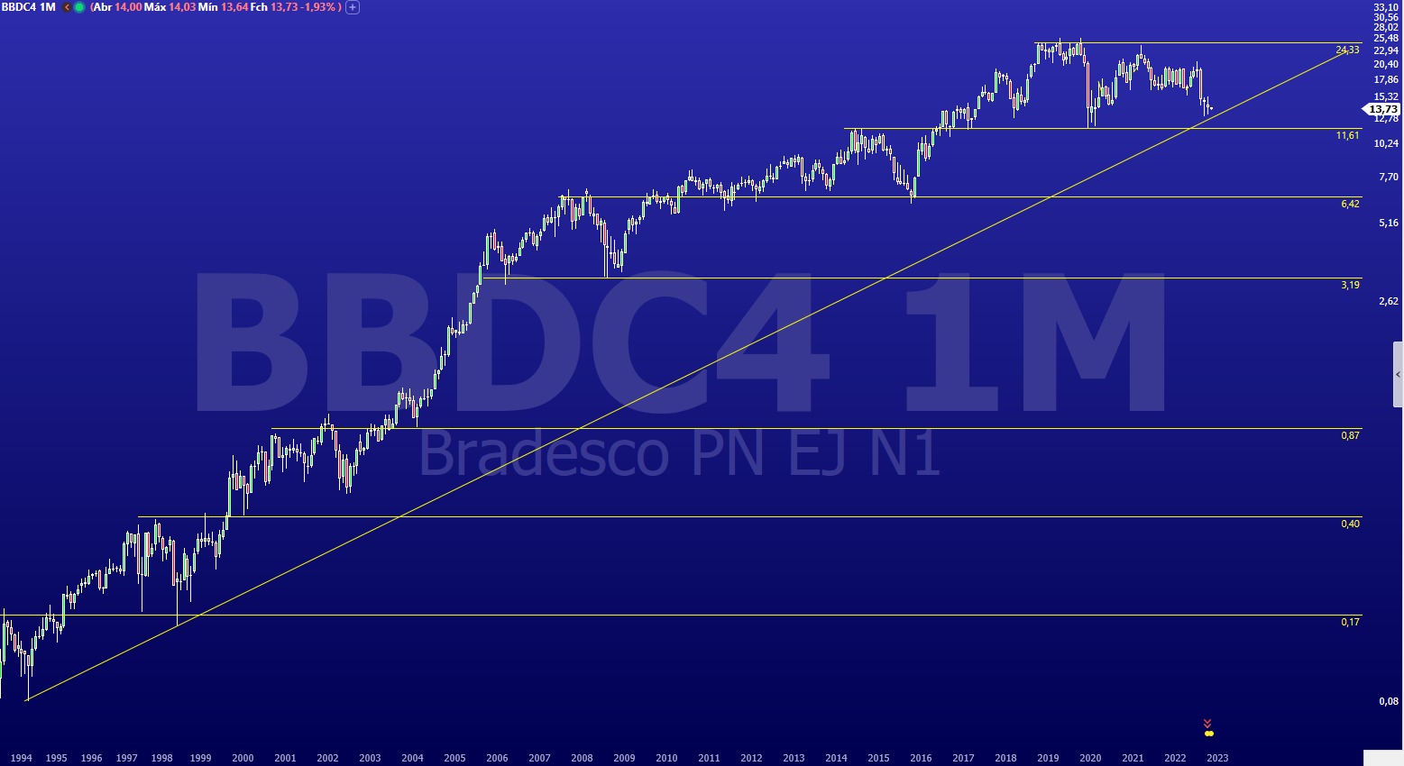 As ações do Bradesco (BBDC4) registram desvalorização de 6,76% em 2023, iniciando o pregão desta segunda-feira (6) cotadas a R$ 13,63. Segundo analistas técnicos, os papéis do bancos seguem em um movimento de lateralização, sem um tendência definida.