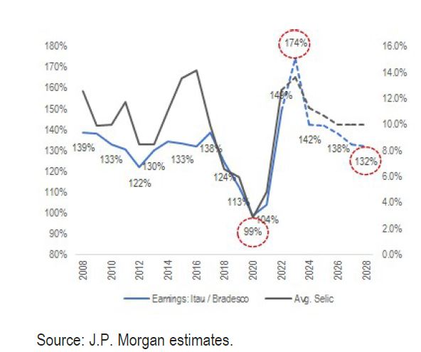 Confira abaixo o gráfico do JPMorgan que mostra a relação entre os lucros do Itaú e do Bradesco (earnings: Itau/Bradesco) em relação à Selic (Avg. Selic):