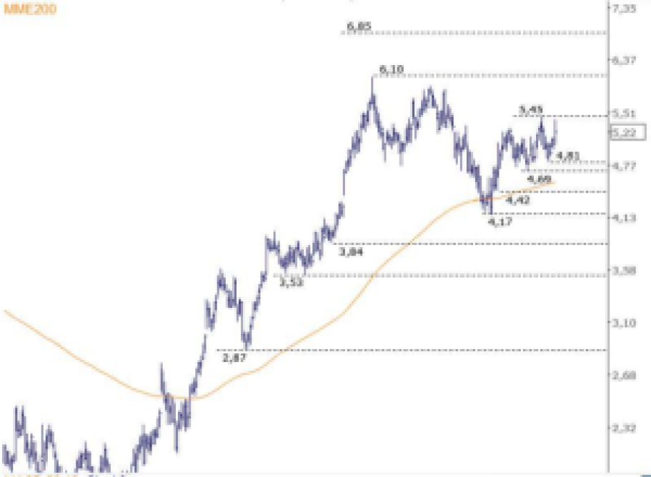 Segundo ele, as resistências mais fortes para se preocupar, após o possível rompimento dos topos anteriores, são R$ 7,90 e R$ 10.