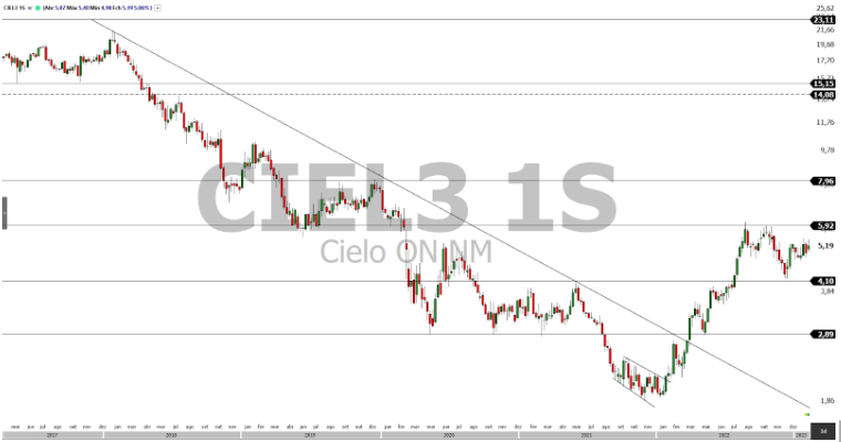 Os analistas técnicos do Itaú BBA Fábio Perina, Lucas Piza e Igor Caixeta, em relatório, destacam que a “CIEL3 colocou fim ao movimento de realização, após segurar no suporte de R$ 4,81.”
