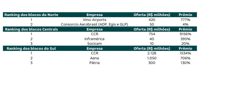 Mizusaki e Fontana lembram ainda que, no leilão, a CCR superou as ofertas da Aena (Espanha), Inframérica, Pátria e Socicam, conforme aponta o quadro abaixo, o que confirma a decisão de ganhar escala para competir com operadoras aeroportuárias globais na América Latina.