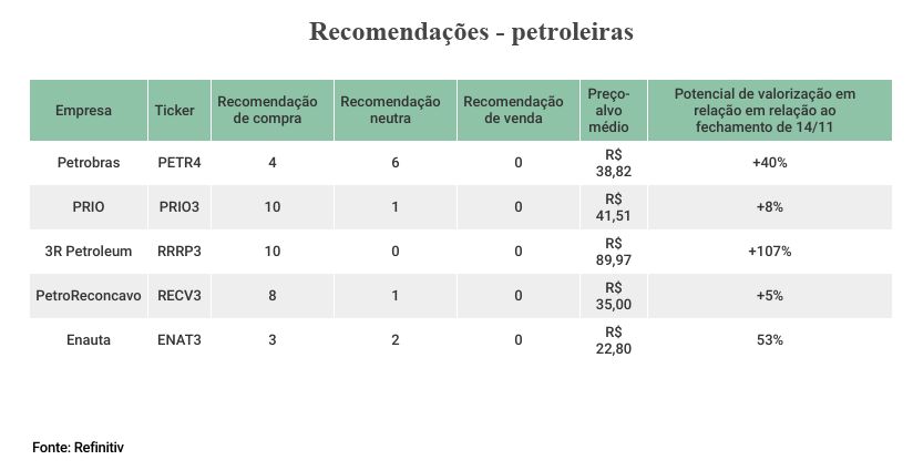 Diversas casas reduziram a recomendação para os ativos da companhia estatal nas últimas semanas, com maiores incertezas sobre a política de dividendos, política de preços de combustíveis e os investimentos que serão feitos a partir de 2023, quando Luiz Inácio Lula da Silva (PT) assumirá a presidência. Isso porque os governos petistas costumam ser mais intervencionistas nas companhias de controle governamental e Lula, durante a sua campanha e depois dela, criticou a condução atual da petroleira.