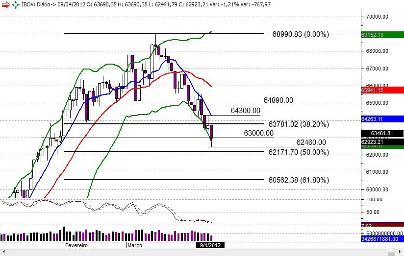 SÃO PAULO – Com queda de 1,21%, chegando aos 62.923 pontos, o Ibovespa perdeu pela primeira vez na última segunda-feira (9), desde 30 de janeiro, o patamar dos 63.000 pontos. Embora tenha se recuperado após atingir mínima intradiária aos 62.420 pontos na vespéra, o índice não conseguiu corrigir todas as perdas, ou romper a resistência, antigo suporte, dos 63.000 pontos, de acordo com Eduardo Collor, analista técnico da Banif Securities.