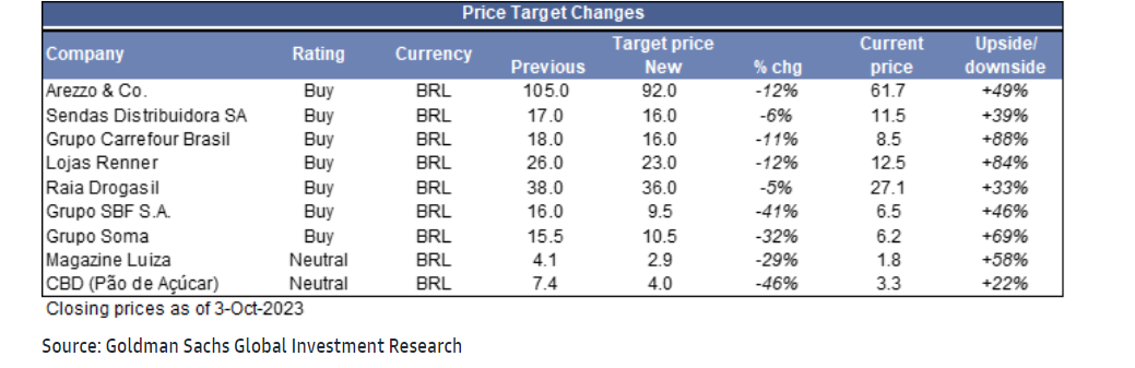 Confira abaixo as preferências detalhadas do Goldman Sachs para o setor de varejo: