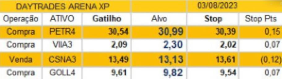 | Ativo | Dia (%) | Valor (R$) | Variação (R$) | Negócios | Semana (%) | Agosto (%) | 2023 (%) | |