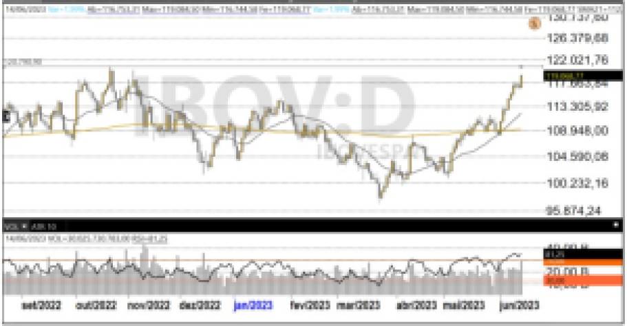 O Ibovespa não fechava acima de 119 mil desde 21 de outubro de 2022, quando encerrou com 119,928,79 pontos. Junho agora tem oito sessões em alta e apenas um, a de ontem, no vermelho.