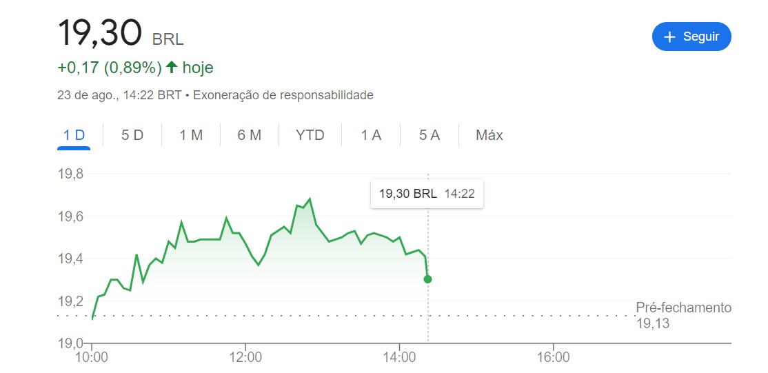 | Ativo | Negócios | Dia (%) | Valor (R$) | Variação (R$) | Semana (%) | Agosto (%) | 2023 (%) | |