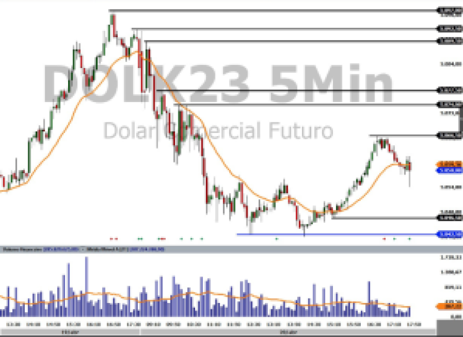 Ibovespa Futuro fecha com queda de 0,37%, aos 105.750 pontos; e dólar futuro, com queda de 0,35%, a R$ 5,0405